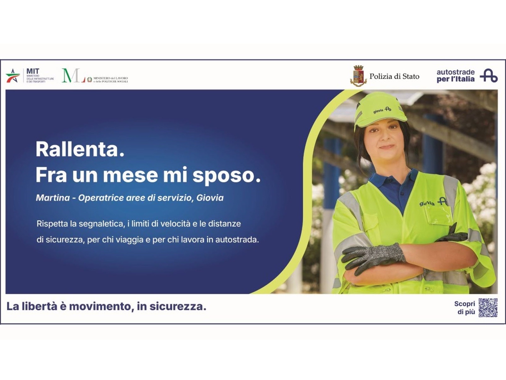 La campagna, che richiama il claim “La libertà è movimento, in sicurezza”, ricorda l’importanza del rispetto delle regole stradali, in particolare in prossimità di un’area di cantiere e in presenza di persone al lavoro: dall’attenzione alla segnaletica, al rispetto della distanza di sicurezza e dei limiti di velocità.