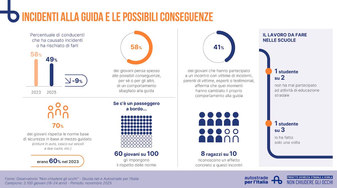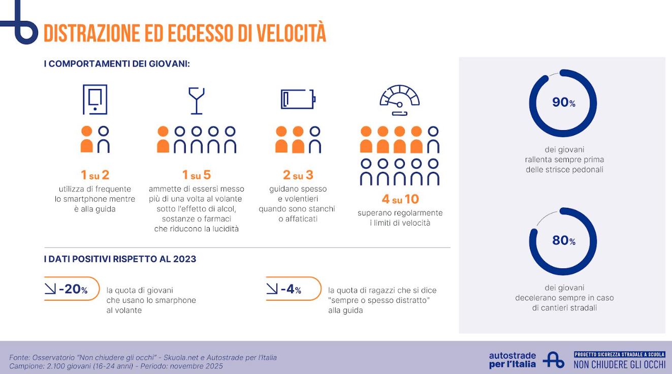 A dare profondità e concretezza al messaggio arrivano i dati dell’Osservatorio Non chiudere gli occhi, realizzato da Skuola.net per Autostrade per l’Italia. L’indagine, che coinvolge 2.100 ragazze e ragazzi tra i 16 e i 24 anni, fotografa senza sconti il rapporto tra giovani e strada. I numeri parlano chiaro: quasi un giovane su due utilizza ancora lo smartphone mentre guida, due su tre si mettono al volante quando sono stanchi o affaticati, uno su cinque ammette di aver guidato sotto l’effetto di alcol o sostanze, quattro su dieci superano regolarmente i limiti di velocità.