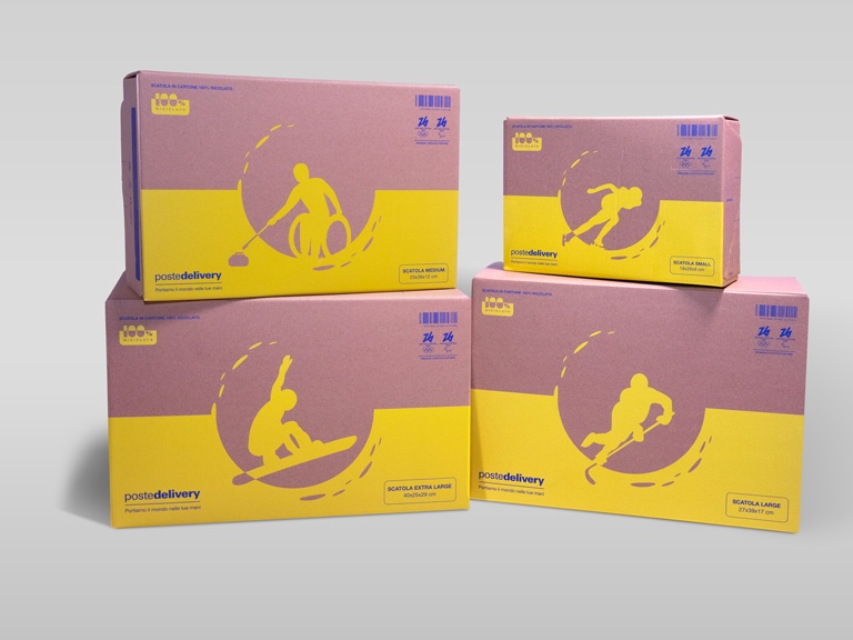 Si tratta di contenitori di cartone riciclato e riciclabile, certificati dal Forest Stewardship Council e decorati da una grafica che richiama le discipline delle Olimpiadi e Paralimpiadi invernali di Milano-Cortina 2026, di cui il Gruppo è Premium logistics partner. Sia le buste che le scatole sono contrassegnate dal marchio "100% riciclato" che ne certifica la composizione.