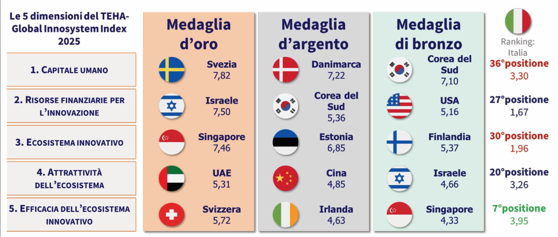 Il TEHA - Global Innosystem 2025 classifica la capacità innovativa di 47 economie mondiali valutando cinque dimensioni: Il Capitale Umano, le Risorse finanziarie a supporto dell’innovazione, l’Innovatività dell’Ecosistema, l’Attrattività dell’ecosistema e l’Efficacia dell’ecosistema innovativo. All’interno di questa graduatoria, l’Italia occupa la trentesima posizione. (Vedi Figura 1)