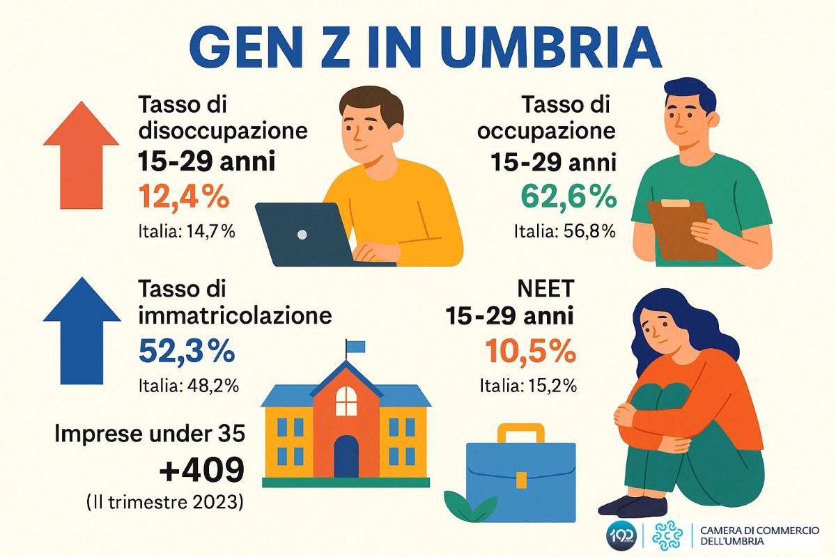In Umbria la Generazione Z — chi oggi ha tra 13 e 28 anni — non è un orizzonte lontano: è un motore reale dell’economia regionale. I numeri parlano di disoccupazione giovanile in calo e partecipazione al mercato del lavoro in aumento, con un tasso di attività che supera sia la media del Centro sia quella nazionale. Ma la vera svolta viene dalla formazione: più iscrizioni universitarie, più percorsi tecnici e professionali, più attenzione alle competenze che servono alle filiere produttive. Emerge dal report della Camera di Commercio.