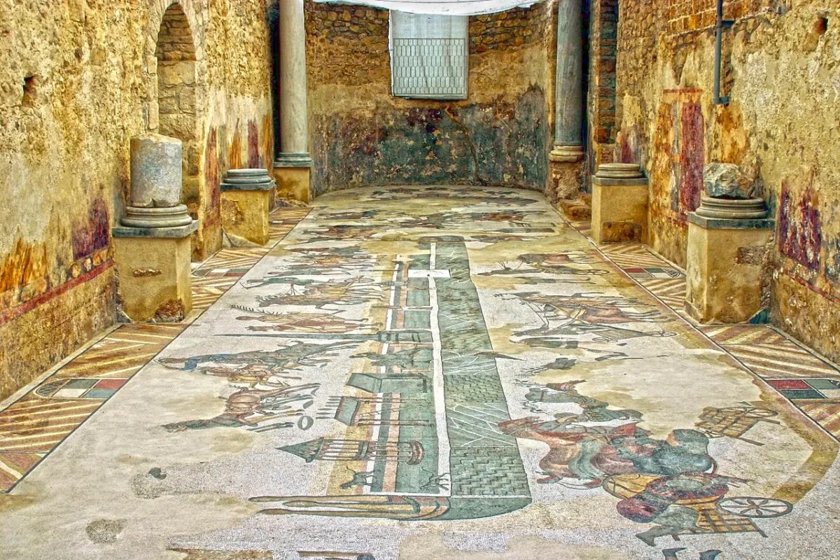 L’etichetta di “seconda Villa dei Misteri” nasce spontanea: la raffinatezza delle decorazioni musive evoca i celebri affreschi pompeiani, reinterpretati con tecnica pavimentale. Mentre a Pompei la Villa dei Misteri incanta per le pitture dionisiache, qui è il pavimento a raccontare la storia, con una vivacità cromatica sorprendente e una potenza narrativa immersiva.