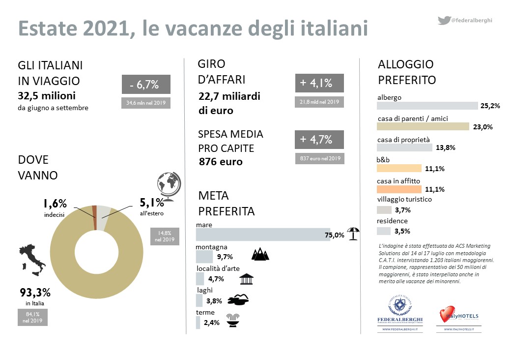 L’indagine, che riguarda tutti i tipi di vacanza, non solo quella in albergo, è stata realizzata da Federalberghi con il supporto tecnico dell’Istituto ACS Marketing Solutions ed effettuata dal 14 al 17 luglio con il sistema C.A.T.I. (interviste telefoniche) ad un campione di 1.203 italiani maggiorenni rappresentativo degli oltre 50 milioni di connazionali maggiorenni.