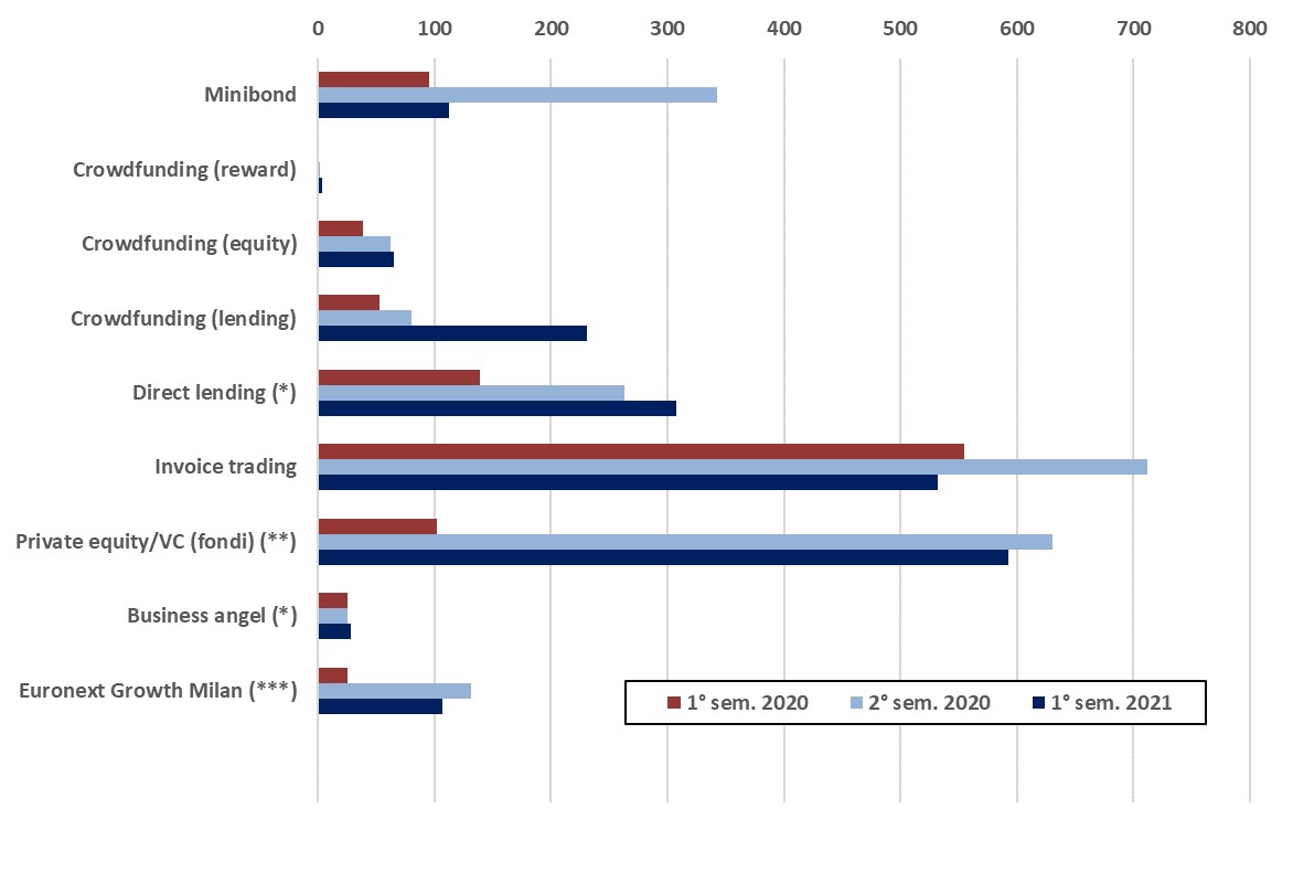 Figura 1 - Valori dei flussi di finanziamento da canali alternativi al credito bancario per le PMI italiane. Evoluzione degli ultimi semestri (valori in € milioni) – (*): stima; (**): solo operazioni di early stage ed expansion; (***): OPS e aumenti di capitale, escluse le SPAC.