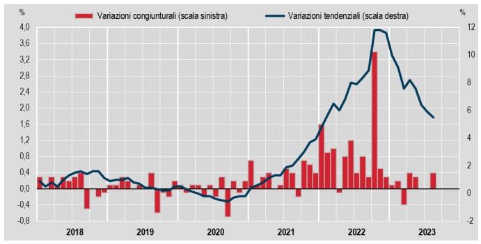 Rispetto al mese precedente calano i prezzi dei beni alimentari, per la cura della casa e della persona  (da +10,2% a +9,6%), mentre sono in controtendenza quelli dei prodotti ad alta frequenza d'acquisto (da +5,5% a +7%). L'aumento congiunturale dell'indice generale si deve principalmente all'aumento dei prezzi degli energetici, sia regolamentati (+2%) che non regolamentati (+1,7%), dei servizi relativi ai trasporti (+1,2%), degli alimentari lavorati (+0,8%), dei beni durevoli e dei servizi relativi all'abitazione (+0,4% entrambi). Effetti sono stati solo in parte compensati dall'attenuazione dei prezzi degli Alimentari non lavorati (-0,5%).
