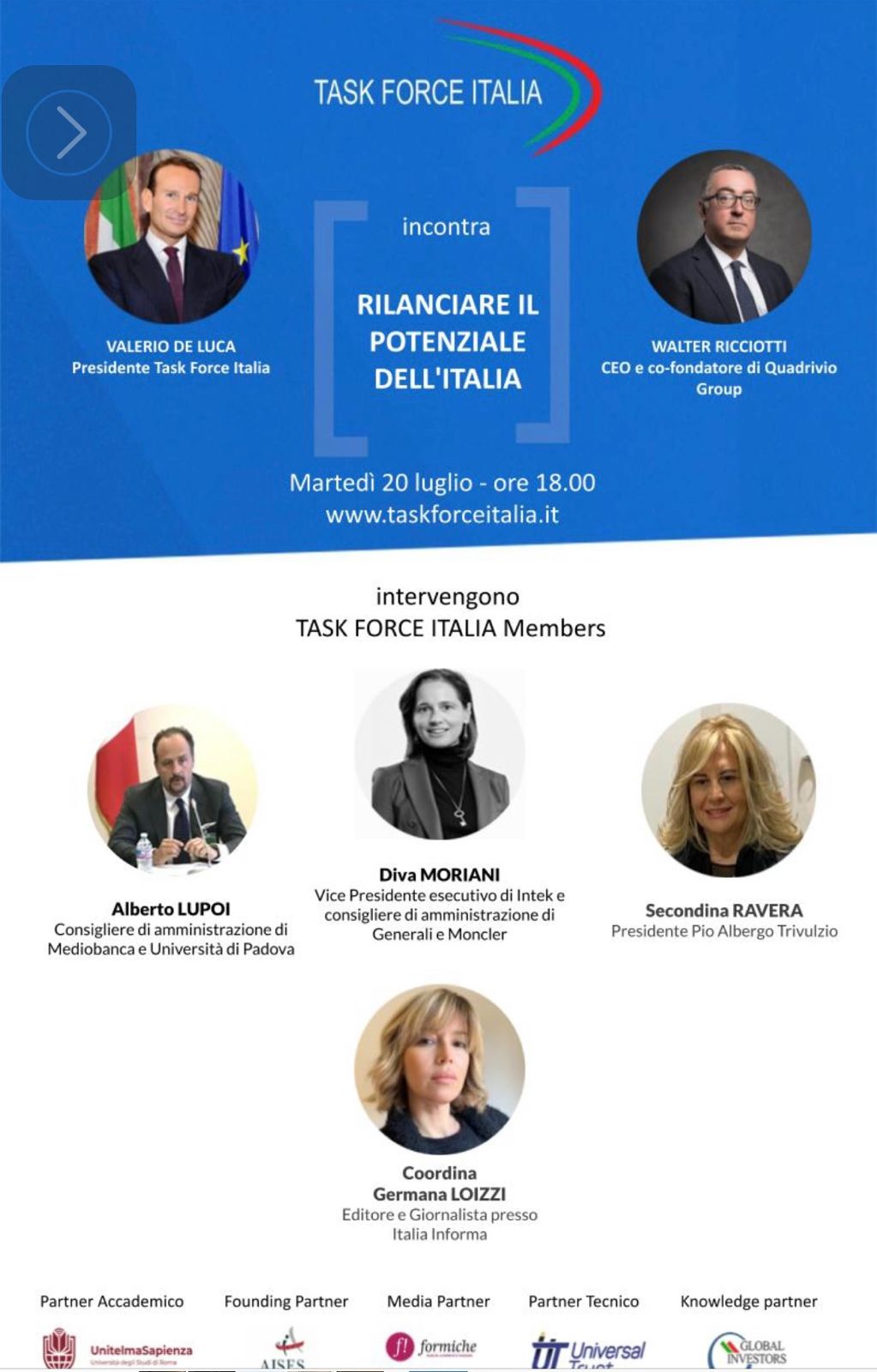Così come i precedenti appuntamenti, anche quello di domani, incentrato sull'incontro con Walter Ricciotti, servirà a consolidare il ruolo di Task Force Italia quale crogiuolo di idee, suggerimenti ed anche analisi delle criticità, poi messi a disposizione del Paese.  Il web talk sarà coordinato da Germana Loizzi, giornalista ed editore di Italia Informa, e vedrà la partecipazione di Alberto Lupoi, consigliere d'amministrazione di Mediobanca e Università di Padova; Diva Moriani, vicepresidente esecutivo di Intek Group e consigliere d'amministrazione di Generali e Moncler; Dina Ravera, presidente del Pio Albergo Trivulzio.