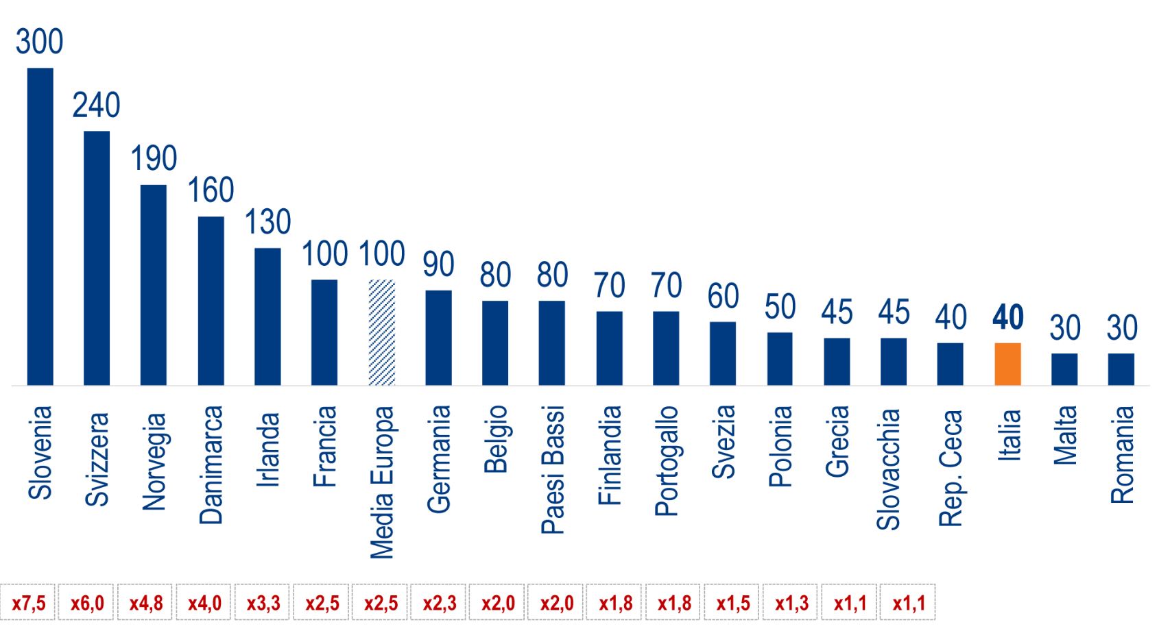 poco più di 40 Euro per abitante all’anno (rispetto a una media europea annua di 100 Euro per abitante), l’Italia si posiziona agli ultimi posti della classifica europea per investimenti nel