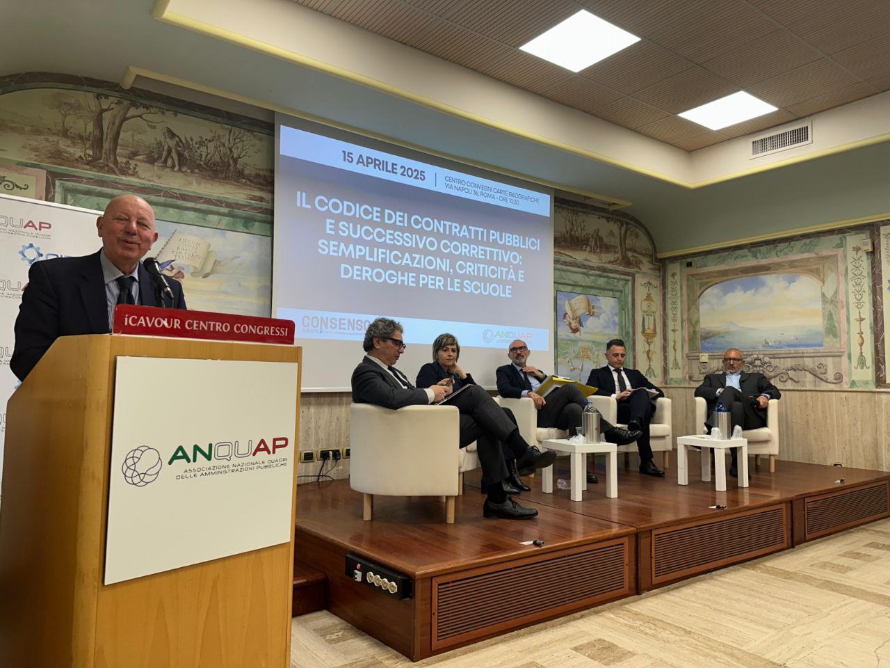 Giorgio Germani, Presidente di Anquap, e Alfonsina Montefusco, Vicepresidente, hanno introdotto la discussione sul “Codice dei Contratti pubblici e successivo correttivo: semplificazioni, criticità e deroghe per le scuole”, concentrandosi sulla necessità di diverse scuole di "lavorare verso il basso", senza la possibilità di applicare serenamente le norme europee.