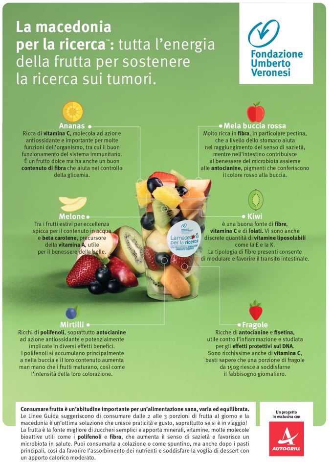 Autogrill, che partecipa al progetto in qualità di partner tecnico ed esclusivo, conferma il suo impegno nel sensibilizzare i viaggiatori sul tema dell'alimentazione sana ed equilibrata, impegno rafforzato dalla collaborazione con Fondazione Umberto Veronesi, nata nel 2021. La scelta di devolvere i ricavi dalla vendita di macedonia è legata ai grandi benefici del consumo frequente di frutta.