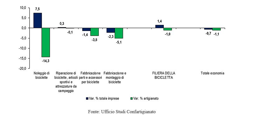 Alla fine del 2022, la filiera della bicicletta, che oltre alla roduzione di biciclette e di loro componenti comprende anche la riparazione ed il noleggio, conta 3.233 imprese. Il cuore della filiera è rappresentato da 1.989 imprese artigiane che sono il 61,5% della filiera, ben 2,5 volte la media del 24,7% registrata per il totale economia. Le imprese della filiera sono soprattutto dedite alla riparazione che conta 1.839 imprese e rappresenta il 56,9% del settore, quota che sale all’81,8% nell’artigianato, in cui si registrano 1.627 imprese di comparto.