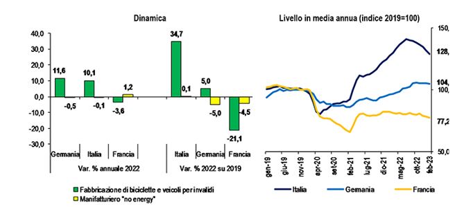 Nella ripresa post pandemia la produzione della bicicletta si è dimostrata molto vivace superando i noti problemi che sta affrontando il sistema manifatturiero, come l’aumento dei costi di materie prime ed energia, il prorogarsi dei tempi di consegna e la crescente mancanza di manodopera, soprattutto se specializzata. Nel 2022 la crescita annuale della produzione del settore è pari, infatti, al 10,1% e rispetto al 2019 si registra un +34,7%, per cui l’Italia stacca nettamente la Germania a +5,0%, mentre la Francia segna un calo del 21,1%.