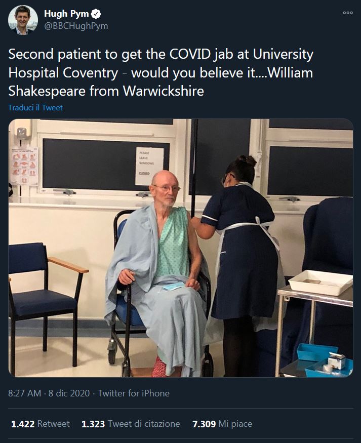 Un momento simbolicamente molto importante quello per la signora Keenan e per tutte le altre persone che oggi hanno ricevuto il vaccino. Curiosamente, il secondo a sottoporsi alla somministrazione è il signor...William Shakespeare.