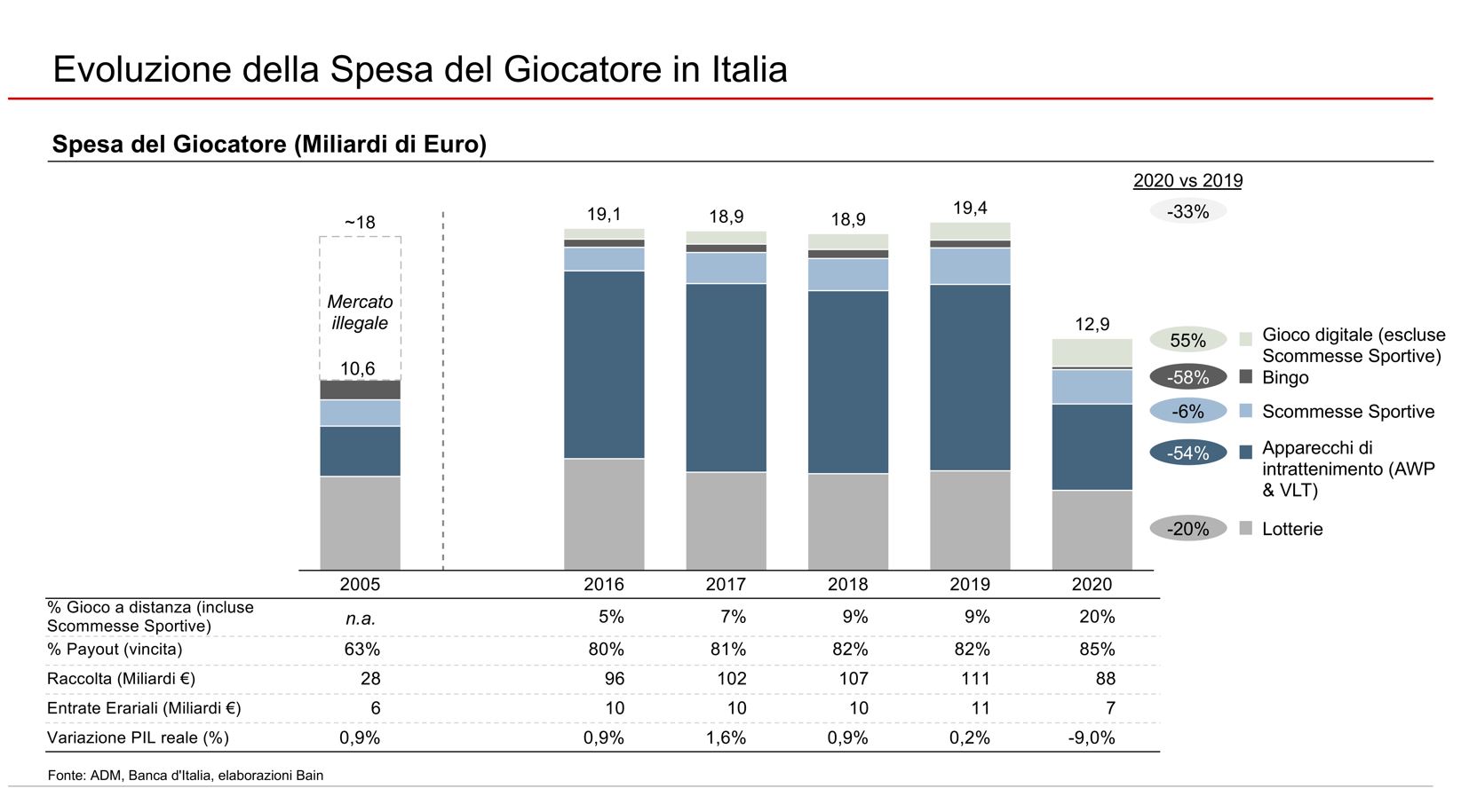 Il settore del gioco in Italia è stato colpito duramente nel corso del 2020 dalla pandemia ed ha nel contempo subito trasformazioni, destinate a mantenersi nella “nuova normalità”, di cui gli operatori dovranno tenere conto per il futuro. Il mercato del gioco italiano è tra i più sviluppati a livello mondiale: è cresciuto grazie ad una lungimirante progressiva regolamentazione dei prodotti da parte del Regolatore, che ha consentito di ridurre fortemente il mercato illegale, facendo emergere un livello di spesa complessiva dei giocatori di circa 19 Miliardi di Euro annui prepandemia, a fronte di una raccolta di oltre 100 Miliardi, generando Entrate Erariali per oltre 10 Miliardi.