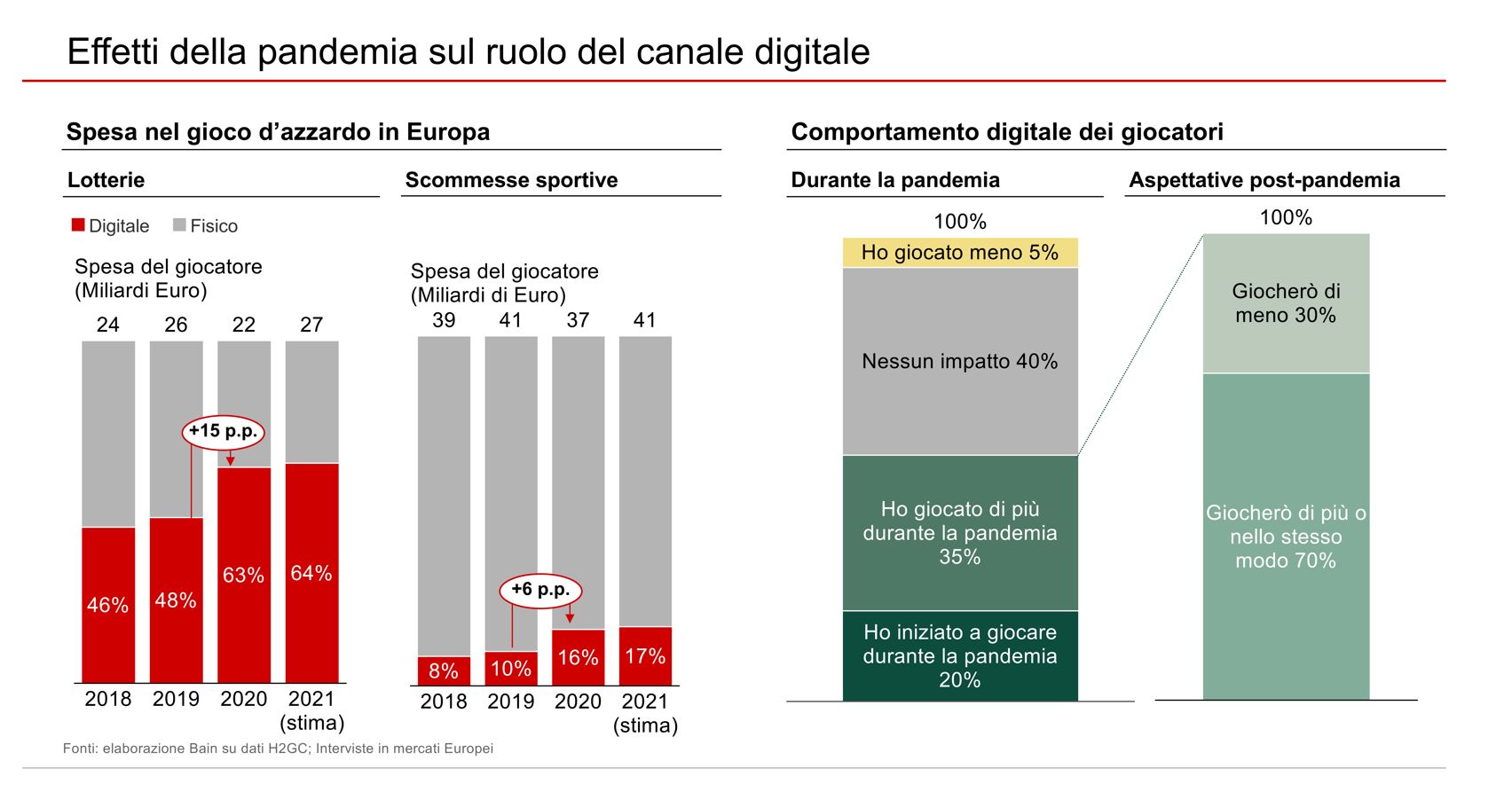• Il settore delle scommesse sportive, dopo una fase di quasi “azzeramento” dovuto all’assenza di eventi, ha poi recuperato in corso d’anno, chiudendo il 2020 con un lieve calo rispetto al 2019, ma con un radicale cambio di mix di canale (55% di volumi sul canale digitale nel 2020 rispetto al 38% prima della pandemia;