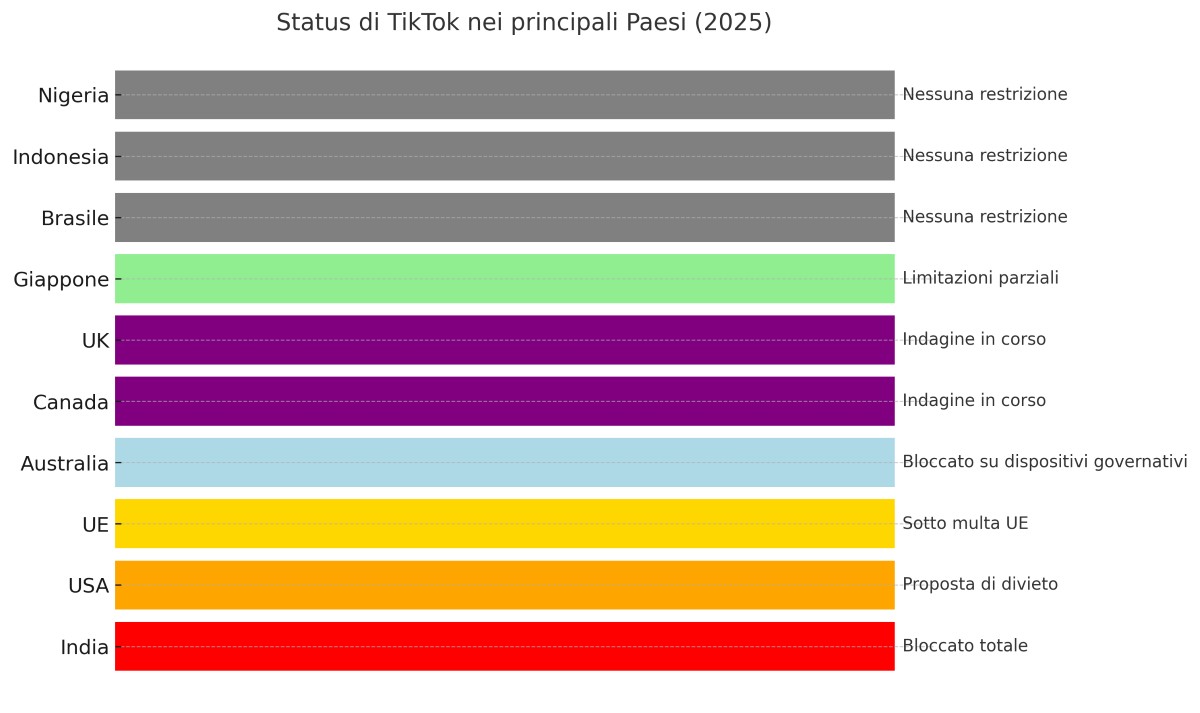 TikTok è diventato un caso diplomatico. L’Australia lo ha bandito dai telefoni governativi. In India è vietato dal 2020. Gli Stati Uniti stanno valutando un divieto totale, con un disegno di legge bipartisan depositato al Congresso nel marzo 2025. L’Europa temporeggia, ma intanto sorveglia.
