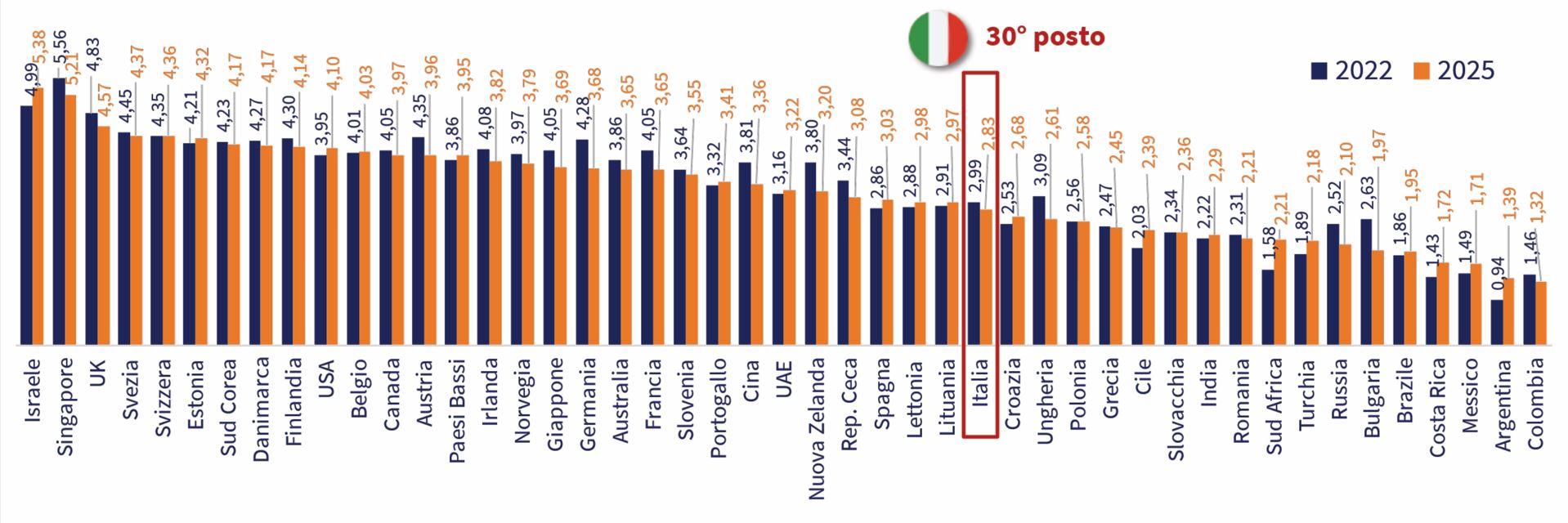 Il TEHA - Global Innosystem 2025 classifica la capacità innovativa di 47 economie mondiali valutando cinque dimensioni: Il Capitale Umano, le Risorse finanziarie a supporto dell’innovazione, l’Innovatività dell’Ecosistema, l’Attrattività dell’ecosistema e l’Efficacia dell’ecosistema innovativo. All’interno di questa graduatoria, l’Italia occupa la trentesima posizione. (Vedi Figura 1)