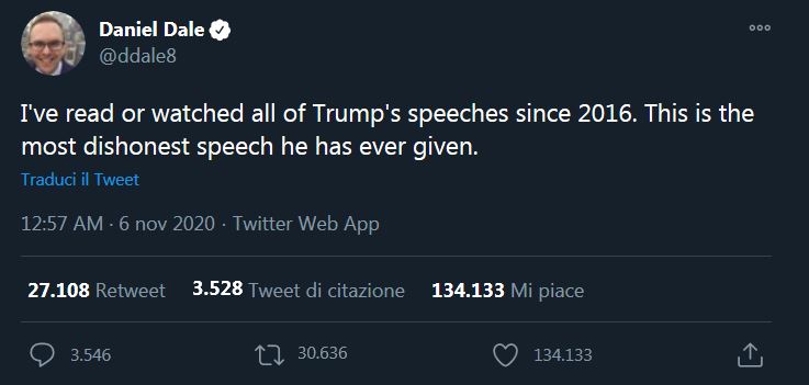 "Che notte triste per gli Stati Uniti d'America vedere il loro presidente (...) accusare falsamente le persone di aver tentato di rubare le elezioni, gettando una rete di bugie" . Il fact checker ufficiale del canale ha definito l'ultimo discorso di Trump