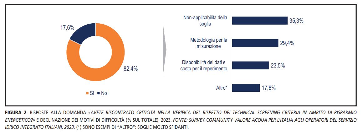 Tuttavia, l’82,4% degli operatori dichiara di aver riscontrato difficoltà ad applicare i Criteri della Tassonomia Europea con riferimento al risparmio energetico (indicatore di consumo medio di energia netta). Le principali difficoltà sono legate alla non applicabilità della soglia, opzione selezionata da oltre un terzo degli operatori del Servizio Idrico Integrato, seguita dalla definizione di una metodologia per la misurazione.