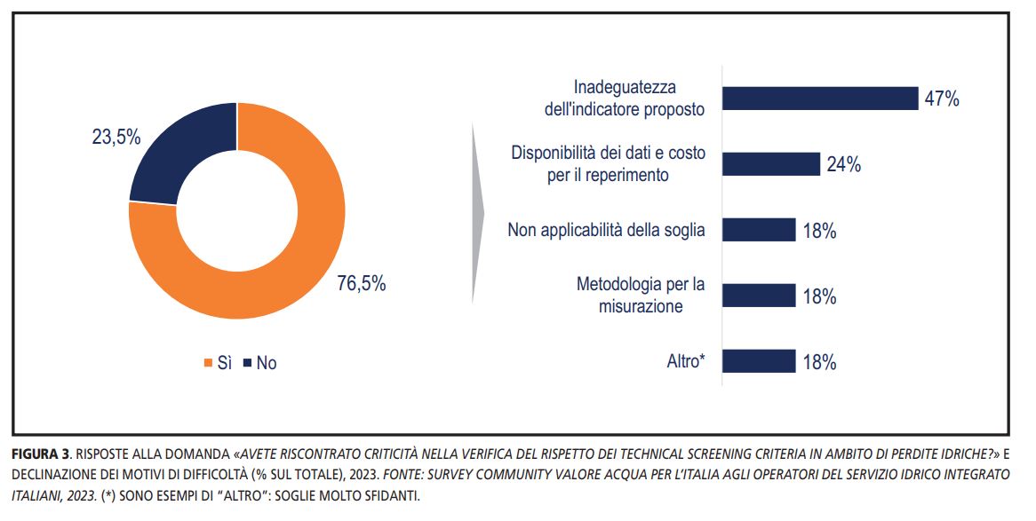 Con riferimento alla percezione degli operatori legata alla gestione delle perdite idriche (indicatore Infrastructure Leakage Index), il 76,5% degli operatori dichiara difficoltà nel rispetto del Criterio Tecnico.
