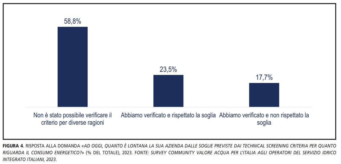 Alla luce delle criticità presentate, al momento solo il 17,7% degli operatori del Servizio Idrico Integrato è riuscito a verificare l’indicatore previsto dai Criteri Tecnici e a rispettare la soglia relativa al consumo energetico, mentre il 23,5% ha verificato e non rispetta la soglia. Il rimanente 58,8% degli operatori del Servizio Idrico Integrato non è riuscito al momento a verificare il Criterio.