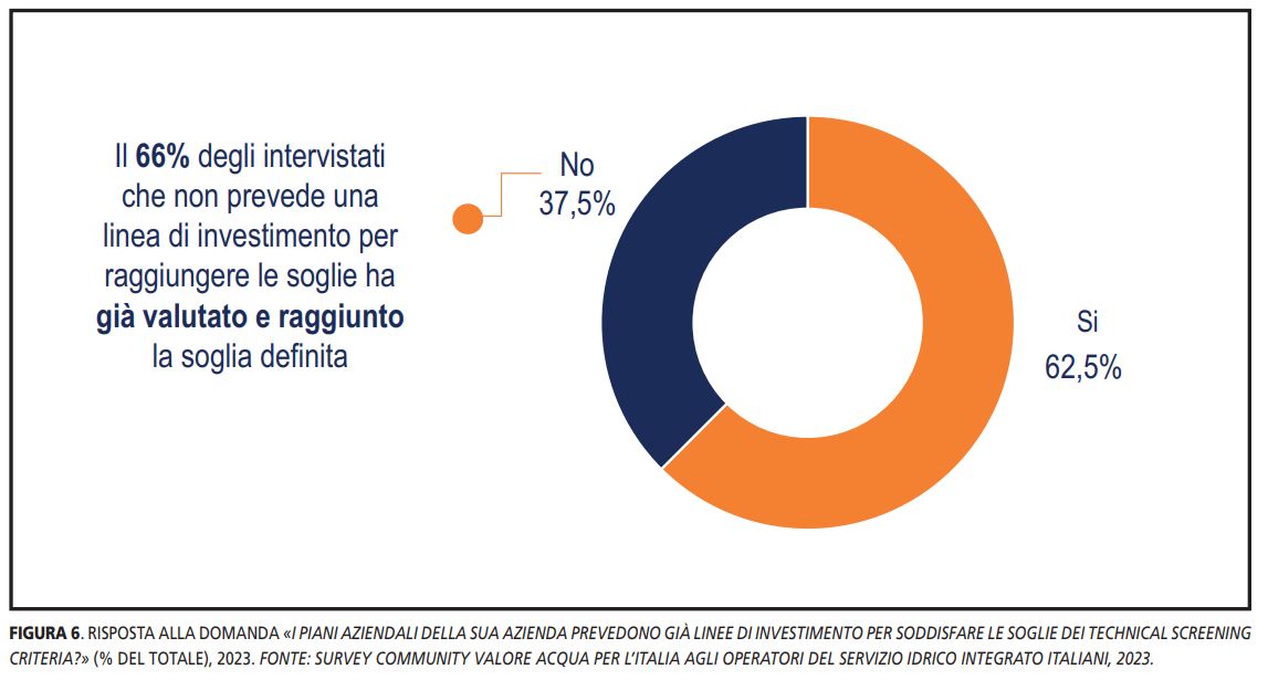 Nonostante le difficoltà emerse sinora, il 62,5% degli operatori del Servizio Idrico Integrato dichiara di aver dedicato appositamente delle linee di investimento all’interno dei futuri piani aziendali per soddisfare i Technical Screening Criteria. É importante sottolineare che tra coloro che non prevedono una linea di investimento, il 66% le ha già verificate e raggiunte.